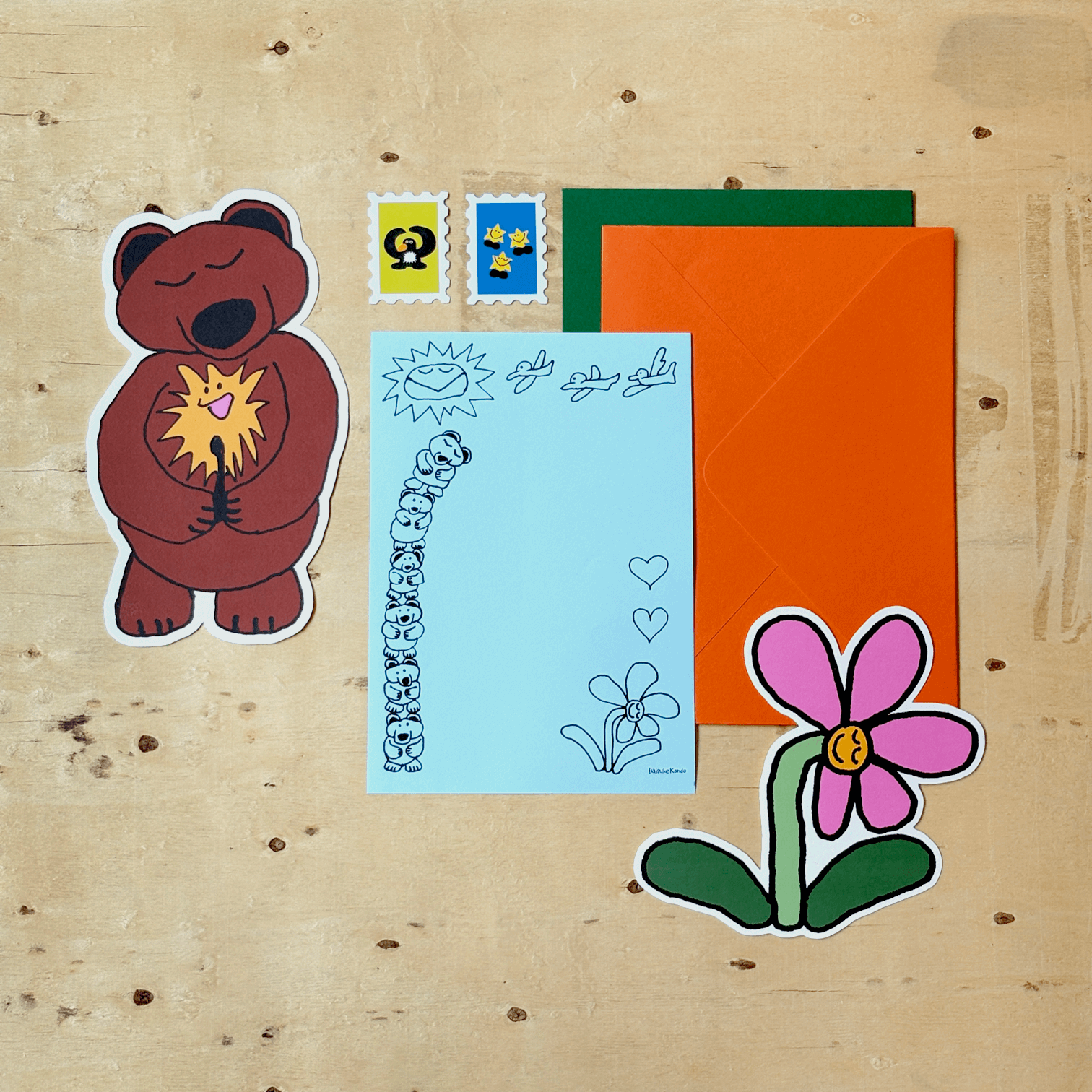 Pen down heartfelt notes for a special someone, or anyone! Featuring Daisuke Kondo’s charming characters, each letter set comes with 2 Colorplan Envelopes, 2 Character Cards, 1 Note Sheet and 2 Stamp Stickers.