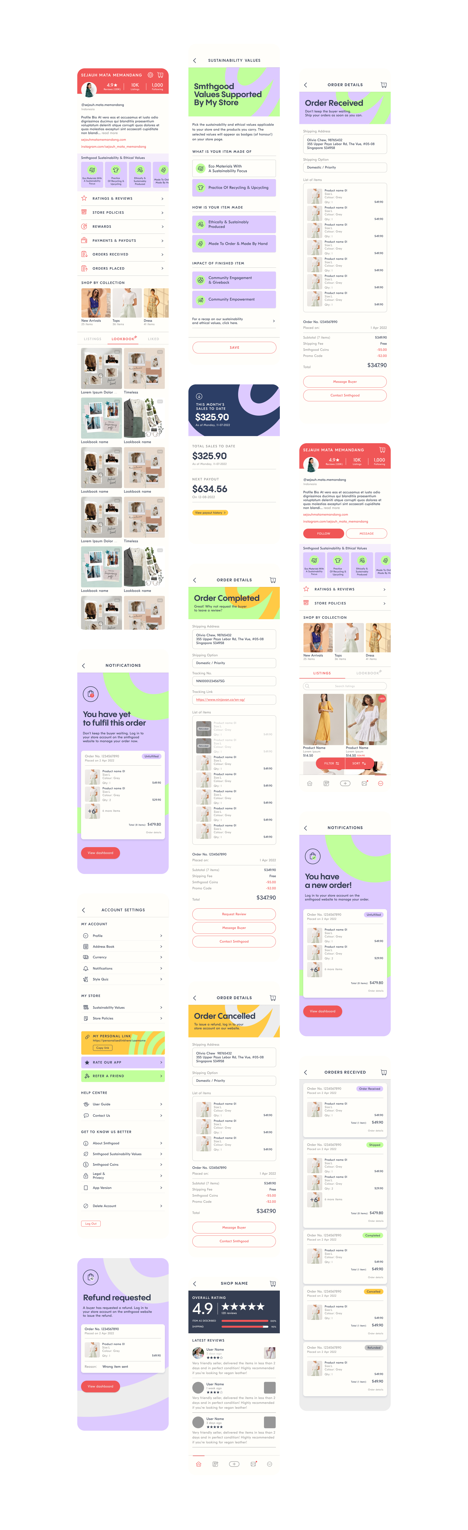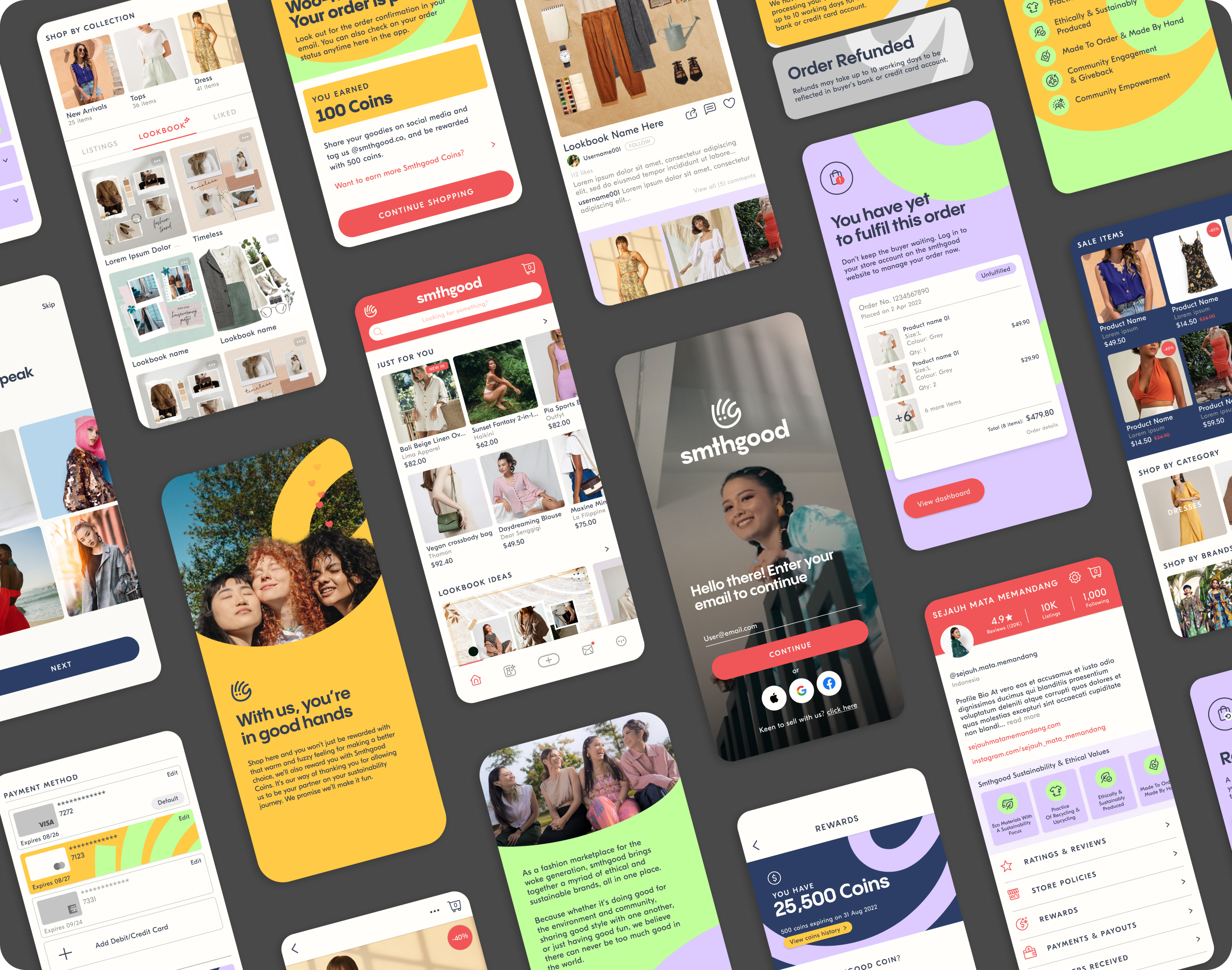 On top of creating the brand identity, we also took on the design and development of the Smthgood app. This included building the entire e-commerce ecosystem, from initial UI/UX wireframing and front-end styling to backend integration and user testing.